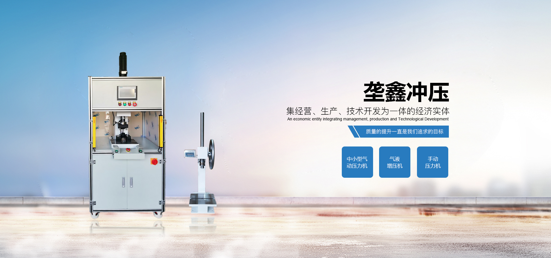 煙臺壟鑫沖壓設備有限公司是集經營、生產、技術開發為一體的經濟實體,專業致力于中小型壓力機、非標壓力機的設計開發和制造。在引進德國、日本等國家先進的鉚壓控制技術及機器設計理念的基礎上,結合相關行業的實際需要,開發出各種臺式、落地式氣動壓力機、手動壓力機、氣液增壓機、氣液增力缸、旋鉚機、無鉚釘鉚接機等鉚接設備。產品應用領域廣泛,適用于汽車零件、電子、電器、家電、包裝、五金、等行業。公司視質量為生命,并一貫遵循對每一臺產品負責,對每一位用戶負責,真誠為您服務。 自公司成立以來,秉承“誠信,創新,專業”的經營理念,以優質的產品,完善的售后服務,樹立良好的品牌形象,服務于廣大新老顧客。我們竭誠于各位同仁攜手并進,共謀發展。